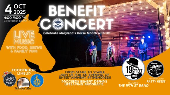 The NOT TO BE MISSED music event is back! Our annual benefit concert welcomes back to Maryland’s premier horse farm, The 19th Street Band and Patty Reese on the front lawn at our Arts & Education Pavilion affectionately called “The Hitching Post”. This year’s concert will celebrate our 36 year history in equine welfare. Enjoy popular food trucks, beer & wine, lawn games, and farm tours to meet our rescue horses – there is something for the whole family!!